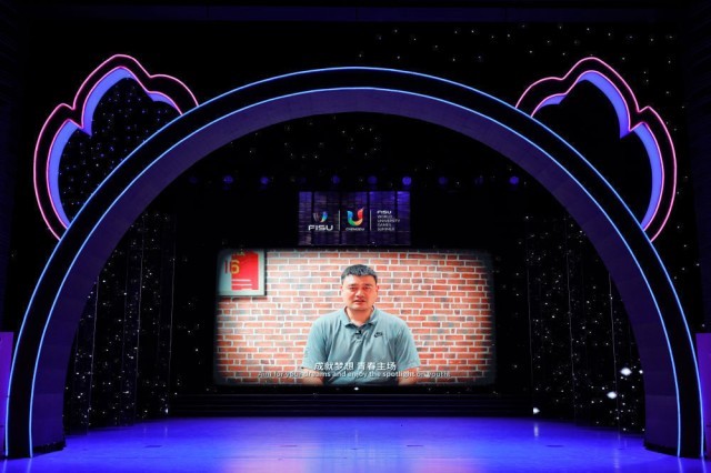 晚会间隙,大屏幕播放了中国篮协主席姚明的视频致辞。2001年,中国首次举办世界大学生运动会,姚明正是那届中国大学生男篮的一员。他回顾了自己参加北京大运会的感受,并祝大学生运动员在赛场内外多交朋友,更好成长。