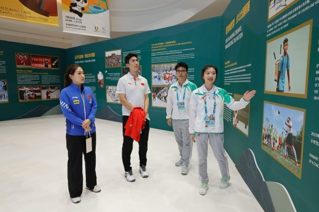 8月6日,奥运冠军武大靖(左二)、刘诗雯(左一)在参观“体育力量 中国精神”中国体育文化展。