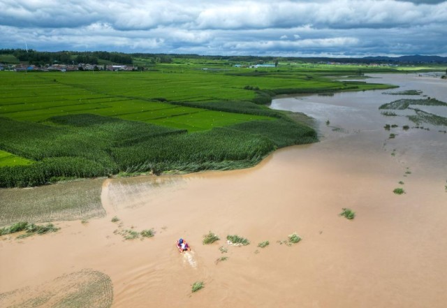 8月5日,搜救队员在吉林省舒兰市七里乡受灾区域开展搜救工作(无人机照片)。新华社记者 颜麟蕴 摄