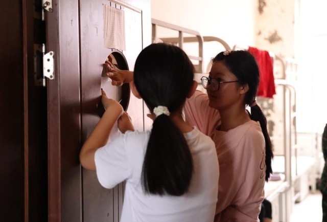 8月4日,被转移的村民在吉林省舒兰市第26中学临时安置点内收拾房间。新华社记者 颜麟蕴 摄