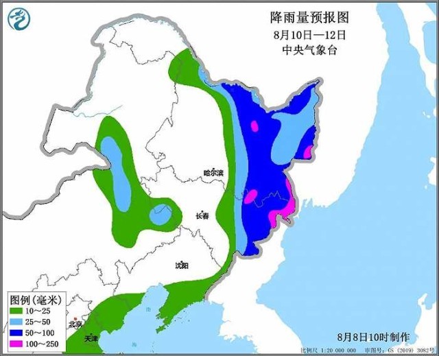 面雨量预报:10-12日,松花江呼兰河段、拉林河段、松花湖以上等子流域面雨量22~28毫米;牡丹江、松花江下游、图们江等子流域累计面雨量75~85毫米。
