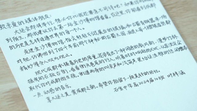 用书信这样一种“原始”而真挚的方式,让当地孩子撷取家乡美食美景推荐给全球媒体朋友,以此传扬友谊,缔结联系,是成都大运会媒体服务项目负责人马雪琪和团队的设想。