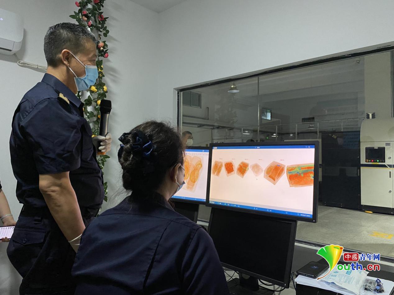 崔莲花与同事正在进行查看货物CT图像。中国青年网记者 张玘云摄