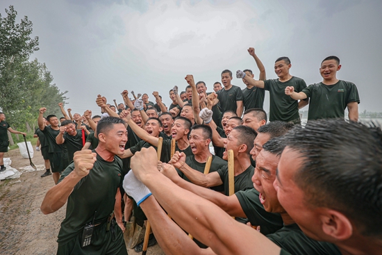 8月5日,在子牙河天津静海段,武警天津总队某中队指导员为任务官兵加油打气。胡东润/摄(新华社发)