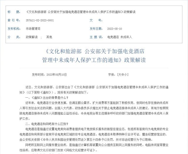 《文化和旅游部 公安部关于加强电竞酒店管理中未成年人保护工作的通知》政策解读