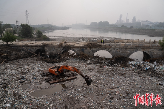 8月10日上午,北京市房山区琉璃河镇琉璃河桥边,相关人员正在清理琉璃河河面上被洪水冲来的垃圾。连日来,当地逐步开展清淤、消杀、排涝等灾后恢复工作。中青报·中青网记者 李峥苨/摄