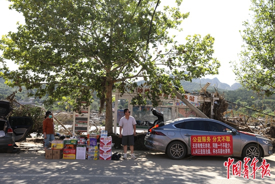 8月5日,北京市门头沟区妙峰山镇丁家滩公交站前,志愿者何诚(右)和鄢大姐为来往的人员免费提供水和食物。何诚家住北京丰台,以前周末常来丁家滩附近郊游,这几天他利用休年假的时间来到这里帮助当地受灾居民。鄢大姐也是自发从北京市其他区赶来的,他们希望尽自己所能为灾区做点事情。中青报·中青网记者 陈剑/摄