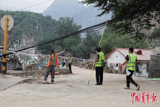 8月6日,北京市门头沟区妙峰山镇担礼村,来自某网络公司的维修人员正在整理修复当地被洪水损坏的网络线路。中青报·中青网记者 陈剑/摄