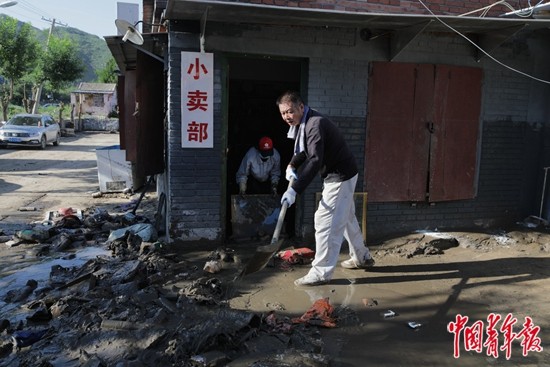 8月5日,北京市门头沟区妙峰山镇丁家滩村,村民刘大哥在朋友的小卖铺前帮忙清理淤泥。
