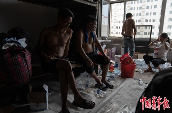 8月5日中午,河北省涿州市,涿州邦创创业孵化基地的工地宿舍内,来自附近建筑工地的工人们刚刚吃过午饭。这个创业基地成为附近工地工人和周边村庄转移居民的灾后临时安置点。