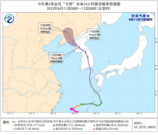 另外,今年第6号台风“卡努”已登陆韩国。中央气象台11日10时继续发布台风蓝色预警,预计“卡努”强度将逐渐减弱,11日夜间移入我国辽宁省境内(热带低压,12—15米/秒,6—7级),也有可能在中朝边界附近地区减弱消散。