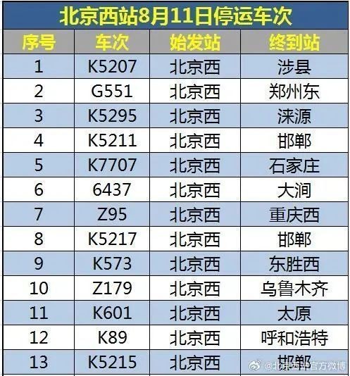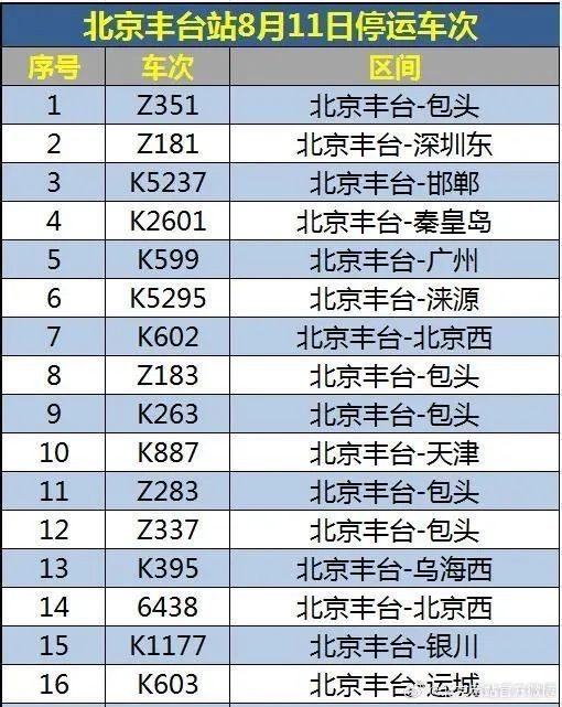 受水害影响,11日北京西站、北京丰台站部分列车停运,已购买停运列车车票的旅客,可于30日内办理全额退票手续。