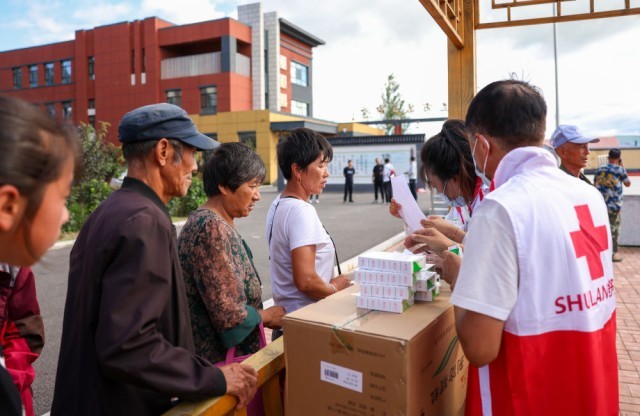 8月11日,村民在舒兰三中安置点领取舒兰市红十字会发放的药品物资。新华社记者颜麟蕴 摄