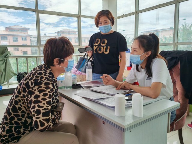 8月12日,在延寿县综合性社会福利中心安置点,工作人员为受灾群众进行登记。新华社记者 杨思琪 摄