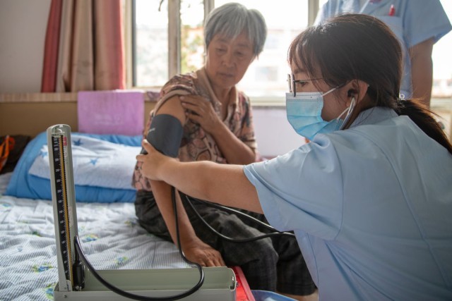 8月12日,在延寿县综合性社会福利中心安置点,一名护士给受灾百姓测量血压。新华社记者 张涛 摄