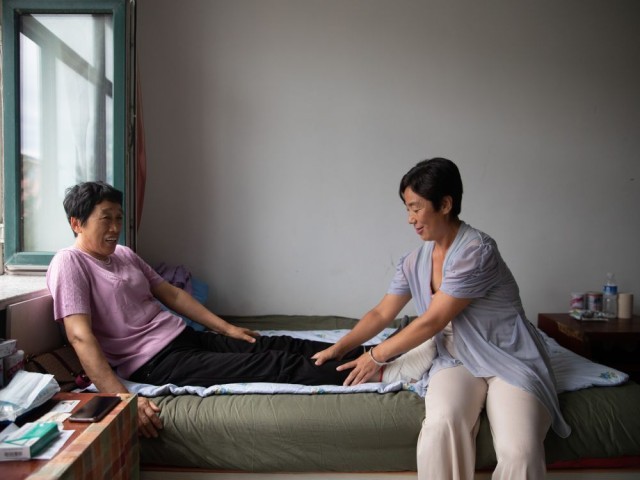 8月12日,在延寿县综合性社会福利中心安置点,延寿县居民王亚玲(右)为母亲按摩。新华社记者 张涛 摄
