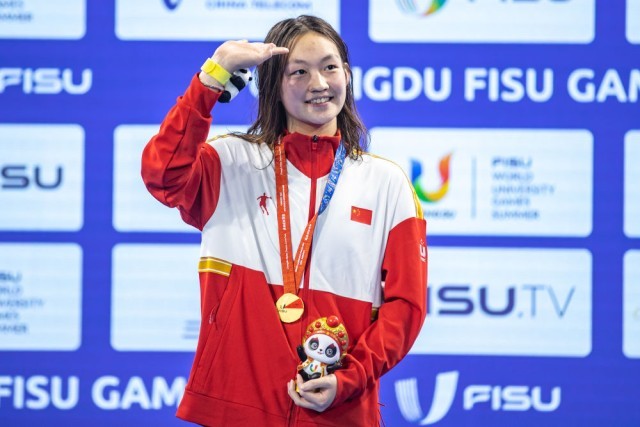 8月4日,李冰洁在颁奖仪式上。当日,在成都举行的第31届世界大学生夏季运动会女子1500米自由泳决赛中,中国选手李冰洁以16分18秒48的成绩获得冠军。新华社记者 黄伟 摄