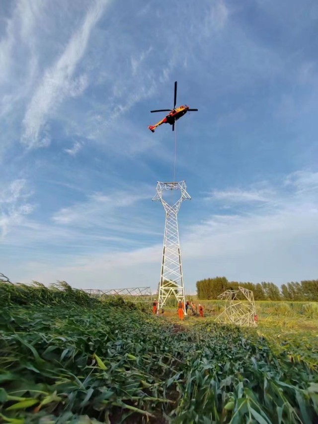 9日,在海林市110千伏长海输电线路抢修现场,一架直升机吊装起沉重的输电铁塔,运送到指定地点。这个输电铁塔处于河流中心岛位置,无法使用常规起重设备。国家电网公司迅速从国网辽宁电力、国网空间技术公司等单位调配直升机支援黑龙江,解决输电铁塔吊装、运输等问题。