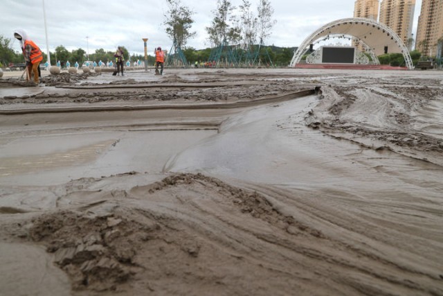 8月11日,在黑龙江省尚志市尚志大街附近,环卫工人在清理淤泥。新华社记者 张涛 摄