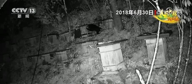 在湖北堵河源国家级自然保护区,经常会发生黑熊下山偷食百姓的庄稼、蜂蜜等农产品。记者通过当地一位村民提供的视频看到,2018年晚上一头成年黑熊来到一蜂箱放置点,黑熊为了取食蜂蜜推倒了一箱蜂箱,并啃食了几口蜂蜜。