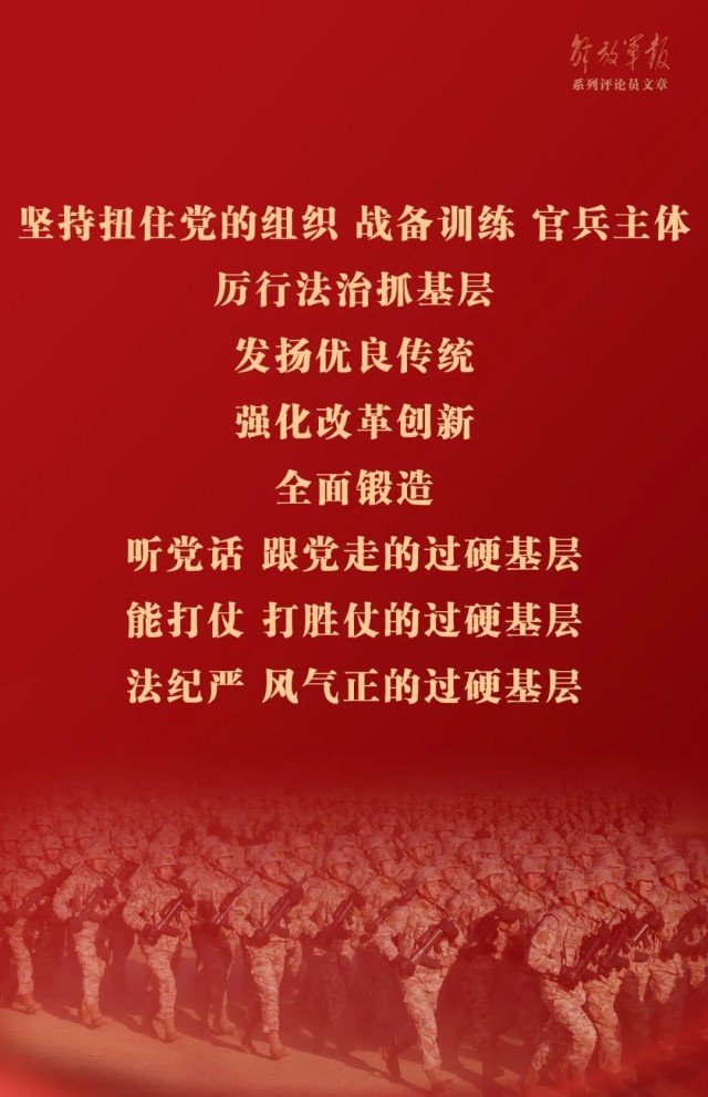 基层是部队全部工作和战斗力的基础。坚持扭住党的组织、战备训练、官兵主体、厉行法治抓基层,发扬优良传统,强化改革创新,全面锻造听党话、跟党走的过硬基层,能打仗、打胜仗的过硬基层,法纪严、风气正的过硬基层。要把正风肃纪反腐压力传导到基层,持续纠治基层“微腐败”,深入开展尊干爱兵、兵兵友爱活动,巩固和发展团结、友爱、和谐、纯洁的内部关系。