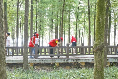 8月15日,志愿者在江西吉安市河长制生态公园参加巡河保洁活动。李 军摄(人民视觉)