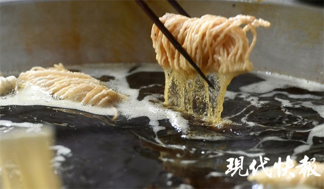 当天,采访团来到这座运河古镇,白墙灰瓦、小桥流水,古镇的韵味扑面而来。在古朴的石板路上走一走,你还能闻到阵阵油香,那是店家正在炸制茶馓。把面团拉成纤细油亮的韧面丝,一圈圈绕在手掌上,粗细均匀的韧面丝一入油锅便香气四溢。