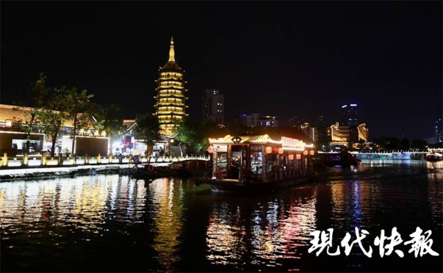 矗立在河畔的国师塔是里运河夜色里最引人注目的风景。塔身高耸,庄严雄伟,在黄色灯光的映衬下,更显飞檐灵动。