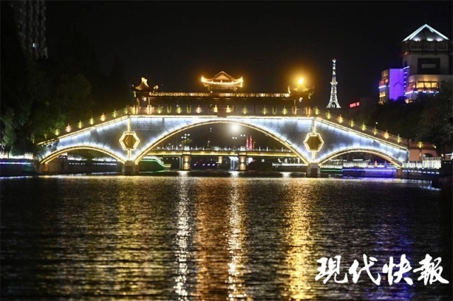 画舫前行,移步换景,灯带勾勒出两岸风光。常盈桥、水门桥、越秀桥……一座座桥梁迎面而来,将淮安昔日的繁华渐次铺展。