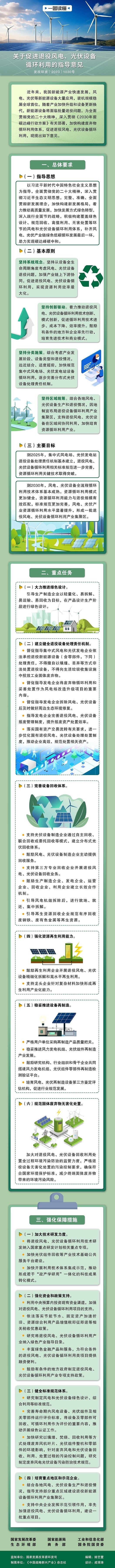 国家发展改革委等部门日前发布关于促进退役风电、光伏设备循环利用的指导意见,其中提到,强化资金和政策支持。利用中央预算内投资现有资金渠道,加强对退役风电、光伏设备循环利用项目的支持。依法落实节能节水、固定资产加速折旧、资源综合利用产品增值税即征即退等相关税收优惠政策。研究将退役风电、光伏设备循环利用产业纳入绿色产业指导目录。丰富绿色金融产品和服务,为符合条件的退役风电、光伏设备循环利用类项目提供融资便利。鼓励有条件的地方制定退役风电、光伏设备循环利用产业专项支持政策。指导意见详情如下: