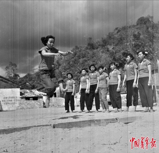 1959年1月,广东省中山县泗门村青年农民业余体校,女子队在练习跳远。学员们用废铁和炮弹头做成“铅球”,把旧房子的木材拆下来改做单双杠和跳高架,还修建了沙坑,并在小河里开辟了一个游泳池。运用这些“土办法”,一所业余体育学校初具规模。贾化民/摄