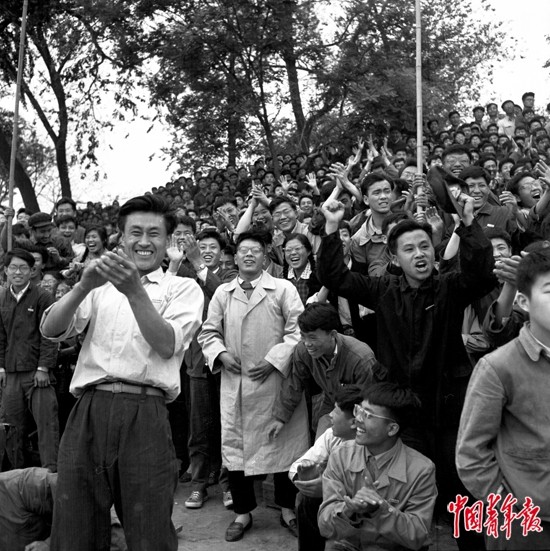 1960年5月,北京西城福绥境公社第一届体育运动大会, 广播器材厂的女工周书君获得4个项目的第一名,工友们跑来为她祝贺。王裕量/摄