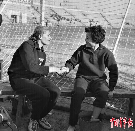 1959年5月14日,北京,罗马尼亚国家田径队应邀来中国访问,罗马尼亚跳高运动员巴拉斯(左)在赛后与“中国跳高第一人”郑凤荣握手并祝她生日快乐。两人曾先后打破女子跳高世界纪录。郁正汶/摄