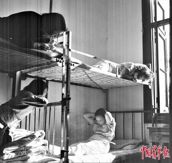 1958年8月,上海,华东政法学院女生寝室,几名女学生在教室友做仰卧起坐。郁正汶/摄