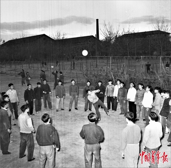 1961年11月,北京矿业学院,学生们下课后在操场进行排球托球练习。王裕量/摄