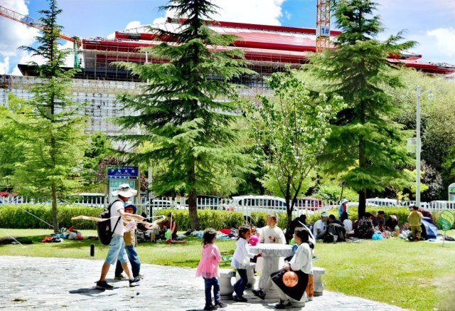 8月17日,布达拉宫广场,游客们拍照留念。新华社记者 刘文博 摄