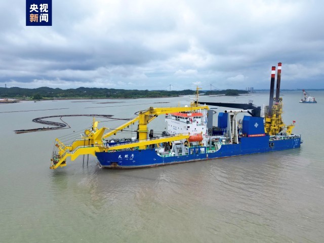 潜入海中的绞刀飞速运转,绞碎的泥沙碎岩经排泥管,由泥泵输送到1200米以外的纳泥区……8月20日,我国自主建造的首艘超大型自航绞吸船“天鲸号”现身平陆运河项目航道15标入海口近海段,开足马力投入平陆运河建设施工。