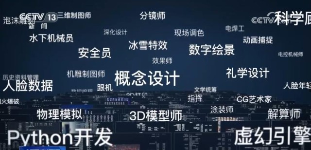 从30多万字的文本中,AI算法识别出了300多个电影产业工种,一条隐藏在幕后的国产电影产业链在眼前展开。这是一个电影产业链越分越细、工种越增越多的过程。20多个新的工种在这10年间诞生,动作捕捉、虚拟拍摄、数控编程、3D打印等,其中,七成以上的新增工种跟数字化技术的进步有关。