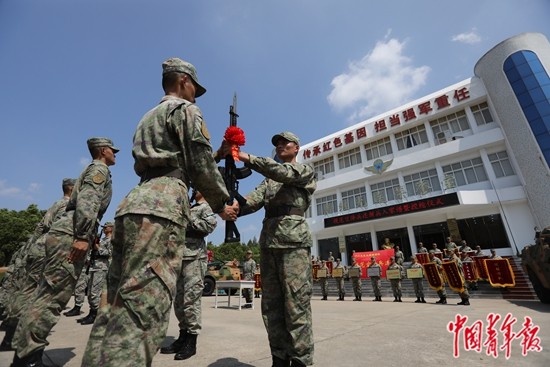 8月16日,空军空降兵某部“模范空降兵连”举行新兵授枪和入家谱仪式。“模范空降兵连”是特级战斗英雄黄继光生前所在连,2013年8月,中央军委主席习近平签署命令,授予该连“模范空降兵连”荣誉称号。