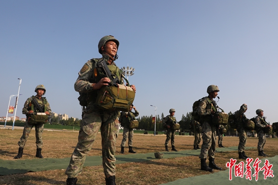 8月16日,空军空降兵某部“模范空降兵连”的战士们进行伞具穿戴训练。