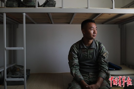 8月17日,空军空降兵某部“模范空降兵连”,程强在宿舍中。他是四川什邡人,2008年“5·12”汶川特大地震,救援部队回撤时,12岁的程强在人群中举着“长大我当空降兵”的横幅送行。2013年,他如愿入伍成为一名空降兵。