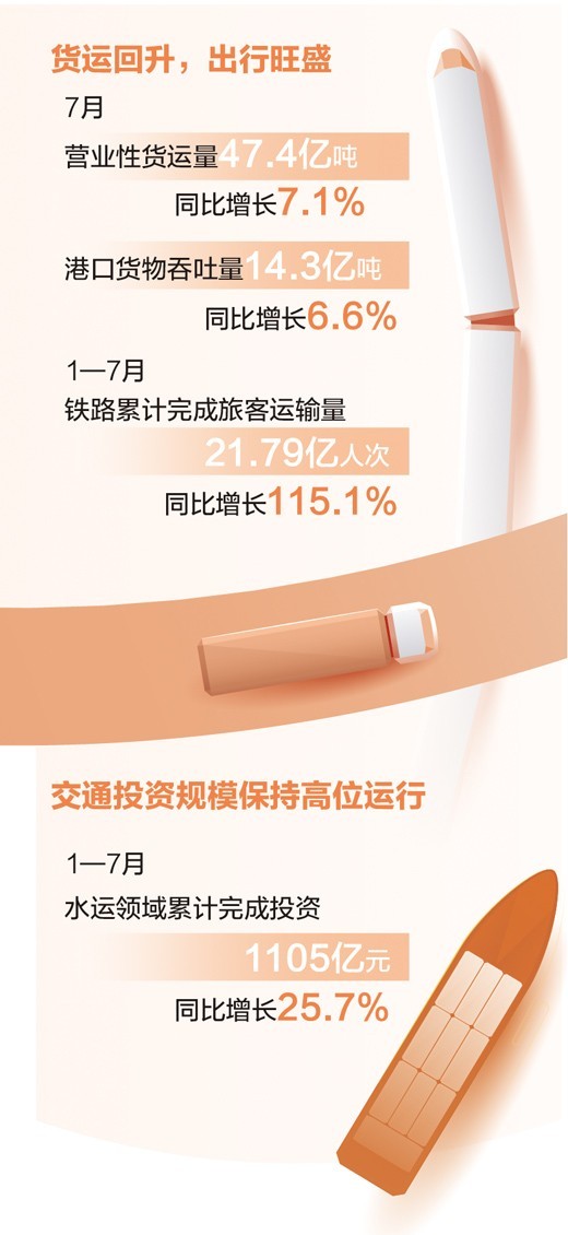 货运回升,出行旺盛,折射出交通运输行业向好、活力更足的态势。“总体看,7月份交通运输经济继续保持恢复态势,主要指标同比均实现增长。”交通运输部政研室副主任孙文剑说。