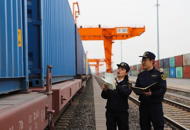 天津海关关员对即将发运的中欧班列进行现场监管。天津海关供图