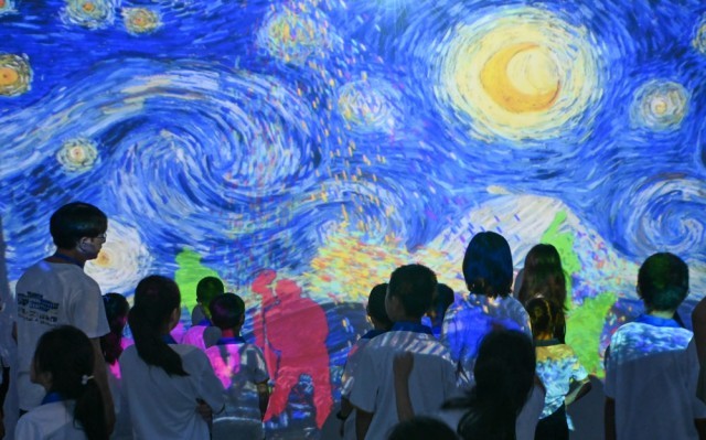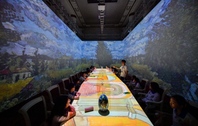 7月30日,在天津数字艺术博物馆,学生们沉浸式参观油画艺术作品。新华社记者 孙凡越 摄