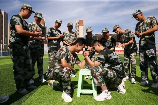 8月23日,济南市第三中学领秀校区,高一新生在参加军训间隙掰手腕。视觉中国供图