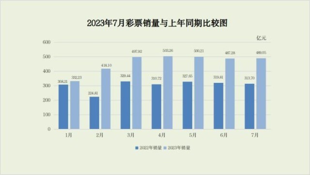 1-7月累计,全国共销售彩票3228.04亿元,同比增加1093.71亿元,增长51.2%。其中,福利彩票机构销售1076.82亿元,同比增加204.41亿元,增长23.4%;体育彩票机构销售2151.21亿元,同比增加889.30亿元,增长70.5%。