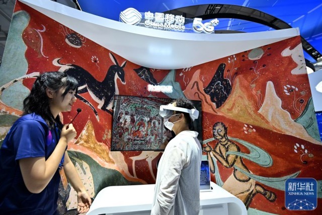 ↑9月3日,一名参观者在首钢园中国移动展台体验基于AR/VR特效的敦煌导览,沉浸式感受敦煌壁画的魅力。新华社记者 李鑫 摄