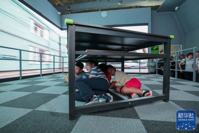 ↑9月3日,小朋友在首钢园内进行模拟地震体验。新华社记者 张玉薇 摄