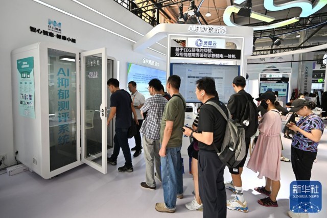 ↑9月3日,参观者在首钢园北京安定医院展台内排队体验AI抑郁测评系统。新华社记者 李鑫 摄