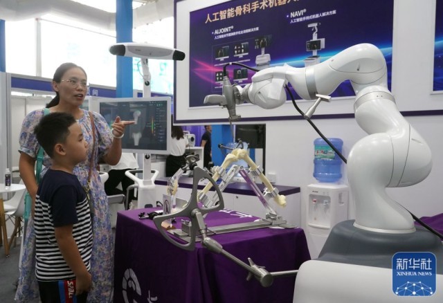 ↑这是9月3日在首钢园拍摄的一款人工智能骨科手术机器人。新华社记者 任超 摄